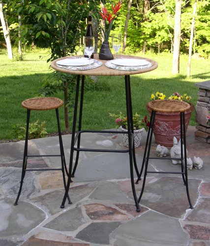 This indoor/outdoor bistro set is great for all of your entertaining needs. The top of the table is a woven PVC wicker construction over a powder coated steel frame. The 2-round stools are constructed with a woven PVC wicker top and powder coated steel frame and are the perfect addition for your bistro table. Constructed of metal and PVC wicker. Clean with a dry non abrasive cloth. Assembly required.