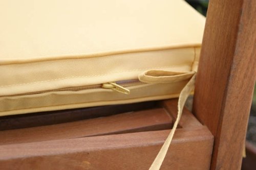 Each cushion has ample length ties to keep your cushion in place even during those gusty days. Single piping provides a clean looking finished edge. These cushions are filled with 2 inches of foam and polyester that makes our already comfortable benches and chairs even more so. Fabric feels soft and comfortable to the touch but is rugged outdoors.