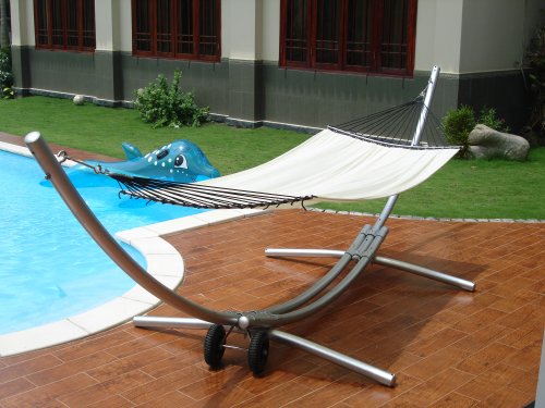 The Laio Hammock Stand will give years of enjoyment as an incredible relaxation element to any backyard or around any pool deck. The commercial-grade tubular steel is carefully polished and finished in multiple coatings, so that it withstands a corrosive environment. The "triple-arc" design and construction provide the most stable hammock in category. The hammock stand comes with wheels to easily move the hammock around the house! It measures 13 1/6 feet in length, 5 feet wide and stands 4 1/4 high.