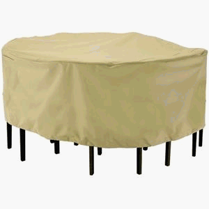 * Patio table and chair set cover * Rain-Tite fabric prevents against rain, snow, sun and dirt * Provides excellent UV protection for your patio table and chairs * Won't crack in cold weather * Dual vents reduce wind lofting and inside condensation * Stay on elastic loops fit over the legs to secure cover during windy days * Elastic cord in bottom hem for a fast and custom fit * 1 year limited warranty * Terrazzo collection * Tan * Fits round table and chair sets up to 94" diameter