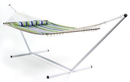 This hammock stand is constructed of 2" diameter 12 gauge heavy steel. This stand features the Signature Right Connection, a 360-degree connection that is welded for superior safety. Spring pin construction reinforces stability of interlocking poles and allows ease in assembly with no use for tools. This stand features a powder coated Tri-beam steel bronze textured finish that is electro-statically applied at a constant temperature for premium adhesion to metal surface. Durable vinyl caps protect all pole ends, heavy duty hardware constructed of 3/8" zinc steel for stronger, durable suspension. * HAMMOCK IS SOLD SEPARATELY*