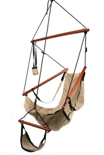 Hang around in The Hammock Air Chair...the hammock of the new millennium! An ultra modern addition to your home! The Hammock Air Chair is the most unique chair you'll ever sit in! You can hang it virtually anywhere indoors or outdoors in minutes. It is specially to designed to conform to the shape of your lower back so it's not only comfortable to sit in, but it eases the tensions and stresses of your spine. It was actually first invented by a chiropractor who wanted to design a chair to alleviate pressures on the lower back and for those with sciatic nerve problems. The Hammock Air Chair is made of 2 layers of strong, durable 600 denier nylon that is double webbed and quadruple stitched around the entire chair. This is The Hammock Air Chair and its the only chair of its kind to have this extreme amount of durability. Its the Cadillac of the hammock air chair industry. This 600 denier nylon outlasts cotton, canvas, and other textiles which most other chairs are made of. The rope is made of 12 Carrier Round hollow braid UV protected polypropylene which is the same rope used in the U.S. Armed Forces. It is extremely durable and weather resistant. It can hold up to 250 pounds of weight. The solid wood dowel supports are made from one of the strongest woods on our planet. They are extra thick and are completely weather resistant. This wood is not only beautiful in quality and feel, but it is remarkably durable. All these materials are weather treated so they will not rot or be damaged by UV rays or inclement weather.