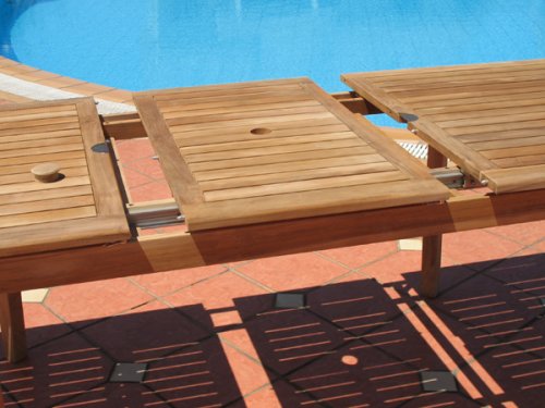 Designed from durable Grade A Teak, the Santorini Teak Extension Dining Patio Set is sure to add a dash of classy elegance to your Backyard Dining Room. The Teak dining table is durable, versatile and easily seats 6-8 people. It can also be shortened for 4 people by storing the leaf and sliding the table together with the metal glides. This Teak table also has a built-in extension leaf and metal slides. Don't worry about condiments, the lazy susan (INCLUDED) will solve the problem. Two 2" umbrella holes lets you enjoy your umbrella in both seating options. The table leaf is self-storing so you don't have to worry about losing it when not in use. You can use the lovely bench in your garden and use it for dining when you extend your table. Don't forget to use the the outdoor cover (INCLUDED) when you are not using the spectacular outdoor teak dining set. Don't forget to check out are large selection of outdoor cushions. SOME ASSEMBLY - CUSHIONS SOLD SEPARATELY