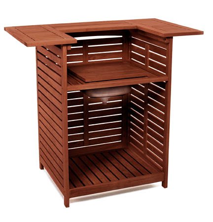 Made of non-endangered tropical Kapur hardwood, this compact bar weathers to a beautiful silver-gray finish. Outdoors, you'll set up for casual evenings by the pool or on your patio; indoors, it's a welcome addition to your family room. The back of the bar is open, providing easy access to two shelves;1 top shelf for use as a counter (with a sink/ice tray) and a second lower shelf for storing glassware, ice buckets, and other essentials, and there's a bottom rack for six bottles of wine. Assembly required. 46"W x 42-1/2"H x 27"D. A word about Kapur Hardwood:
