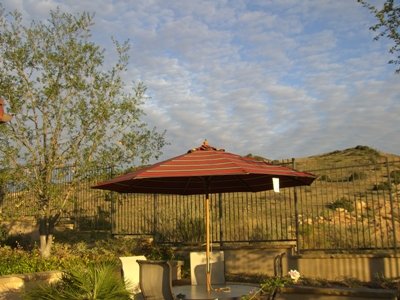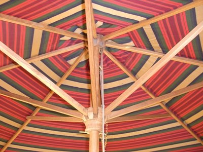 - 10ft teak wood umbrella with Sunbrella acrylic fabric, terra stripe #006- Real teak wood market umbrella