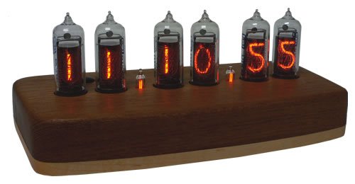 THE ULTIMATE CONVERSATION PIECE! Show your nostalgic fondness for yesterday's technology with a Nixie tube clock. It is rather ironic that in their heyday the use of Nixies was considered too expensive for consumer products like clocks and here we are today! The unmistakable soft orange glow and the remarkable fade display feature in an incredibly beautiful hand rubbed teak and maple base! Then the mere discussion of Russian tubes made during the cold war, with an upside down "2" as a "5"... It just doesn't get any better than that! Get on the retro bandwagon with your very own Nixie classic clock! The IN14TM Features six IN14 Nixie tubes mounted in a beautiful hand crafted Teak and Maple base. The base finish is hand rubbed varnish and linseed oil. The Hours, Minutes, and Seconds are separated by an NE2 Neon bulb matching the era of the clock. Advanced features include brightness control and auto-dim. From the two setting buttons you can increase or decrease the brightness of the Nixies from 0 (off) to 10 (full brightness). You can also set the clock to lower the brightness between two specified hours in the day (such as 08 to 17 when you are not home) to extend tube life or to customize your display for nighttime use. The IN14 is powered by a provided 110VAC to 12VDC power supply, and utilizes a crystal oscillator for the time base that is accurate to 20ppm. A simple calibration procedure can achieve an accuracy even better than 10ppm! The IN14 can be used overseas the optional PS15U power supply. It can also be used with a 12VDC source. Measures 8.25"W x 3"H x 4"D.