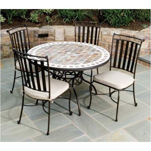 Portobello 48R-4 Dining Group - INCLUDES (1) 48 inch ROUND DINING TABLE AND (4) CLASSICO SIDE CHAIRS. Hand Set and Grouted Mosaic Table Tops finished and sealed for long lasting appearance and durability. Top Quality Wrought Iron Frame, with Durable Powder Coat Finish. One Year Limited Warranty.