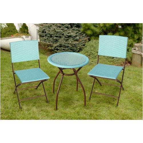 The Bliss Hammocks Wicker Bistro Set - Blue is made of wrought iron and weather resistant resin wicker. No tools needed for assembly. Set consists of a 24 inch x 28 inch table with tempered glass top and 2 folding chairs 21. 5 inch x 18 inch x 33 inch.