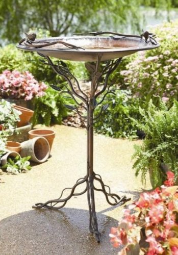 - This round birdbath features with bird sculpture on rim, twig base and brown and copper finish.