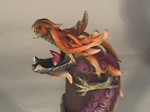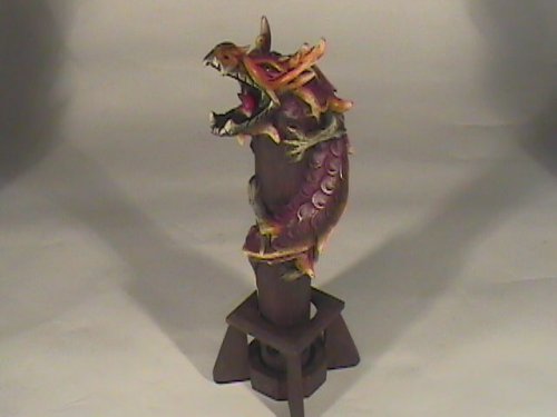 Because each dragon is hand-painted and made one at a time, they are all unique and individual. They are primarily fuchsia with other accent colors. The bamboo tubes they are climbing and matching stands are dark brown stained.