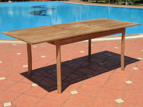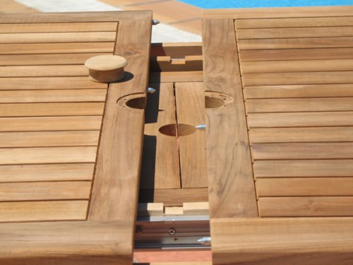Designed from durable Grade A Teak, the Santorini Teak Extension Dining Patio Set is sure to add a dash of classy elegance to your Backyard Dining Room. The Teak dining table is durable, versatile and easily seats 6-8 people. It can also be shortened for 4 people by storing the leaf and sliding the table together with the metal glides. This Teak table also has a built-in extension leaf and metal slides. Don't worry about condiments, the lazy susan (INCLUDED) will solve the problem. Two 2" umbrella holes lets you enjoy your umbrella in both seating options. The table leaf is self-storing so you don't have to worry about losing it when not in use. You can use the lovely bench in your garden and use it for dining when you extend your table. Don't forget to use the the outdoor cover (INCLUDED) when you are not using the spectacular outdoor teak dining set. Don't forget to check out are large selection of outdoor cushions. CUSHIONS SOLD SEPARATELY - SOME ASSEMBLY