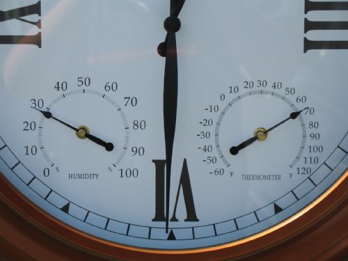 This Parrot Bay 24 Inch Wall Clock with In/Outdoor Temperature has a large 24 inch frame. It features a hydrometer and thermometer. Roman numbers surround the dial. This item is operated by high tech radio controlled movement, so you do not have to reset it with daylight savings time. It is guaranteed by a one year manufacturers warranty and requires one AA battery, not included