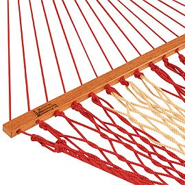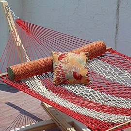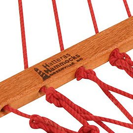 Hatteras Hammocks DC-14CR If your map takes you away from home and down Cabana Row, this is where you will feel warmth of colors and lots of life. It is a collection full of garnet and warm golden tones in bold stripes and tapestry-like designs. Choose any of the durable and reliable wooden or tri-beam steel hammock stands by Hatteras Hammocks to complete your set. Additional Information: -Comes in a casual Garnet and Taupe Two-tone colored DuraCord -Zinc-Plated hardware and Cumaru spreaders -Solution dyed DuraCord rope -Overall Dimensions: 60" W x 82" body, 13' overall length One of the latest innovations in the Hammock industry is the use of DuraCord®. DuraCord® is a superior performance yarn crafted into rope that boasts cotton-like softness. This fabric exceeds industry standards for: -Fade resistance: to 1,000 hours of UV -Stain resistance: will not sustain any microbial growth -Abrasion resistance: rated “excellent” compared to cotton and polyester -Moisture resistance and fast drying: a near-zero moisture regain Hatteras Hammocks offers two unique lines in the Cabana Row and Willow Place collections constructed entirely of 100% DuraCord®. These collections are hand-crafted from color palettes to the structure of the weaves, each with a unique charm and feel to them. The Hatteras Hammocks® Story… Founded in the early seventies by Walter R. Perkins, Jr., Hatteras Hammocks Inc.® began with a desire to improve upon the designs then currently offered. Taking this entrepreneurial spirit with him along the North Carolina coast, Mr. Perkins grew his business from the trunk of his car to the largest hammock manufacturer in the world in 1987. With its sights set on continuous improvement and innovation, Hatteras Hammocks, Inc.® strives to bring the most creative and functional hammocks to the market. Keeping a focus on quality and customer care has helped them become one of the largest and most respected hammock manufacturers in the world.