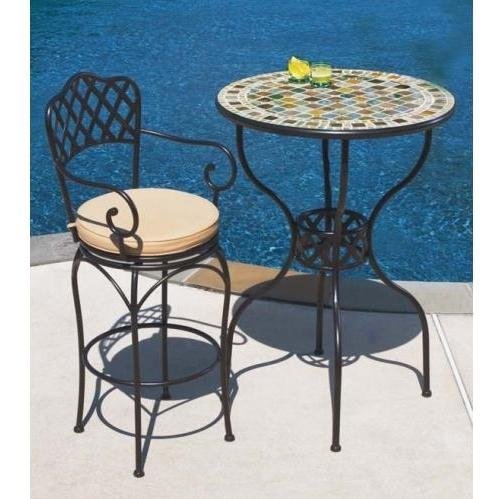 Portobello 30R-2 Bar Bistro Group - INCLUDES (1) 30 inch ROUND BISTRO BAR TABLE AND (2) BASKETWEAE SWIVEL BAR CHAIRS. Hand Set and Grouted Mosaic Table Tops finished and sealed for long lasting appearance and durability. Top Quality Wrought Iron Frame, with Durable Powder Coat Finish. One Year Limited Warranty.