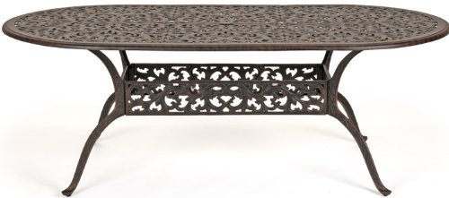 This furniture arrives mostly assembled. 777-B Features: Includes plastic foot levelers Outdoor and indoor use Seats 10 Made of high quality cast aluminum Triple polished with a powder coated paint and an antique finish It will not chip, flake or scratch Finish: Desert Bronze Dimensions: 84"(W) x 42"(D) x 29"(H)